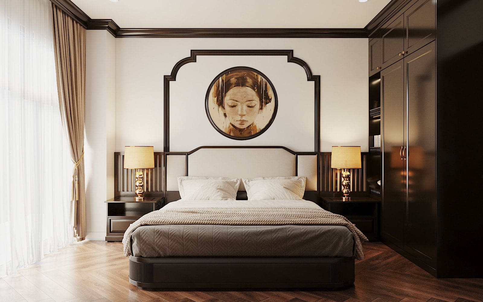Phòng ngủ căn hộ Quận Thanh Xuân được thiết kế theo phong cách Indochine
