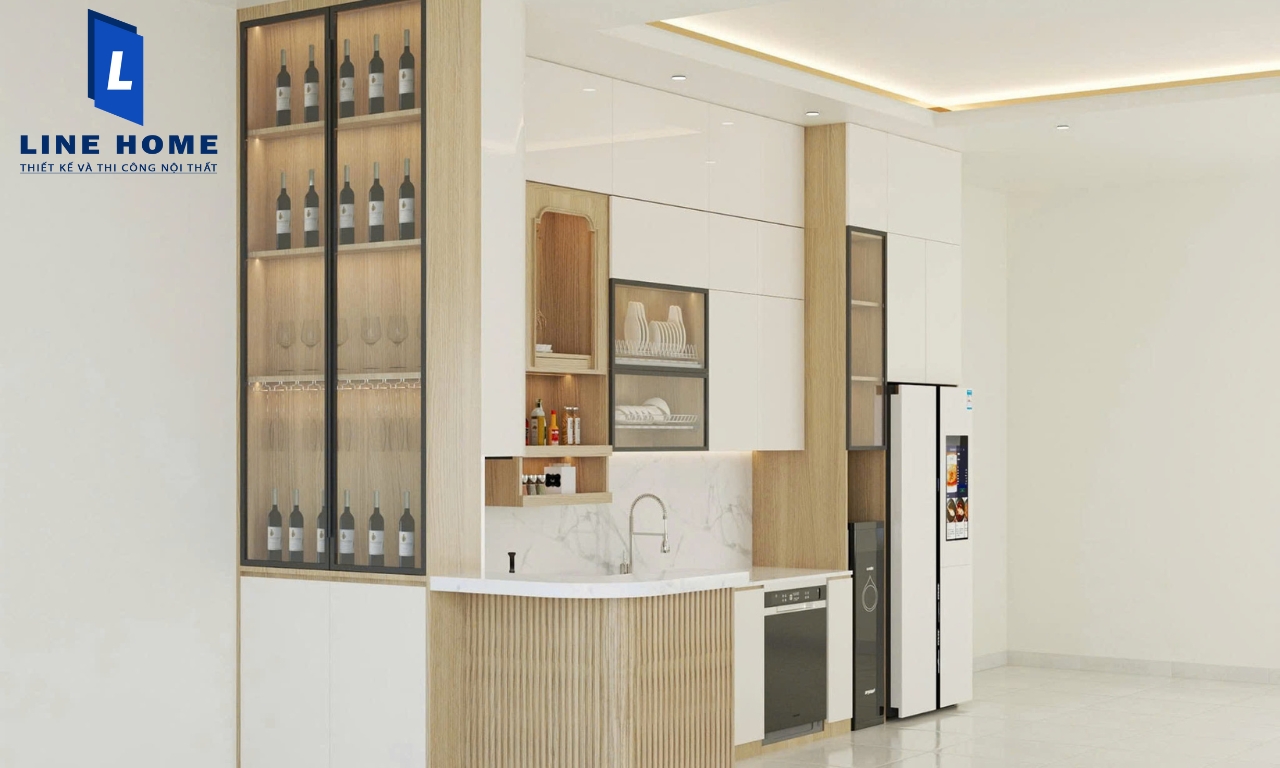 Tủ bếp gỗ công nghiệp được thi công âm tường đụng trần, với bề mặt đá sang trọng, không chỉ mang lại vẻ đẹp thẩm mỹ mà còn giúp cho việc lau chùi và dọn dẹp dễ dàng hơn. Tủ lạnh và máy hút mùi được thiết kế âm tủ giúp không gian thêm phần gọn gàng, tinh tế.