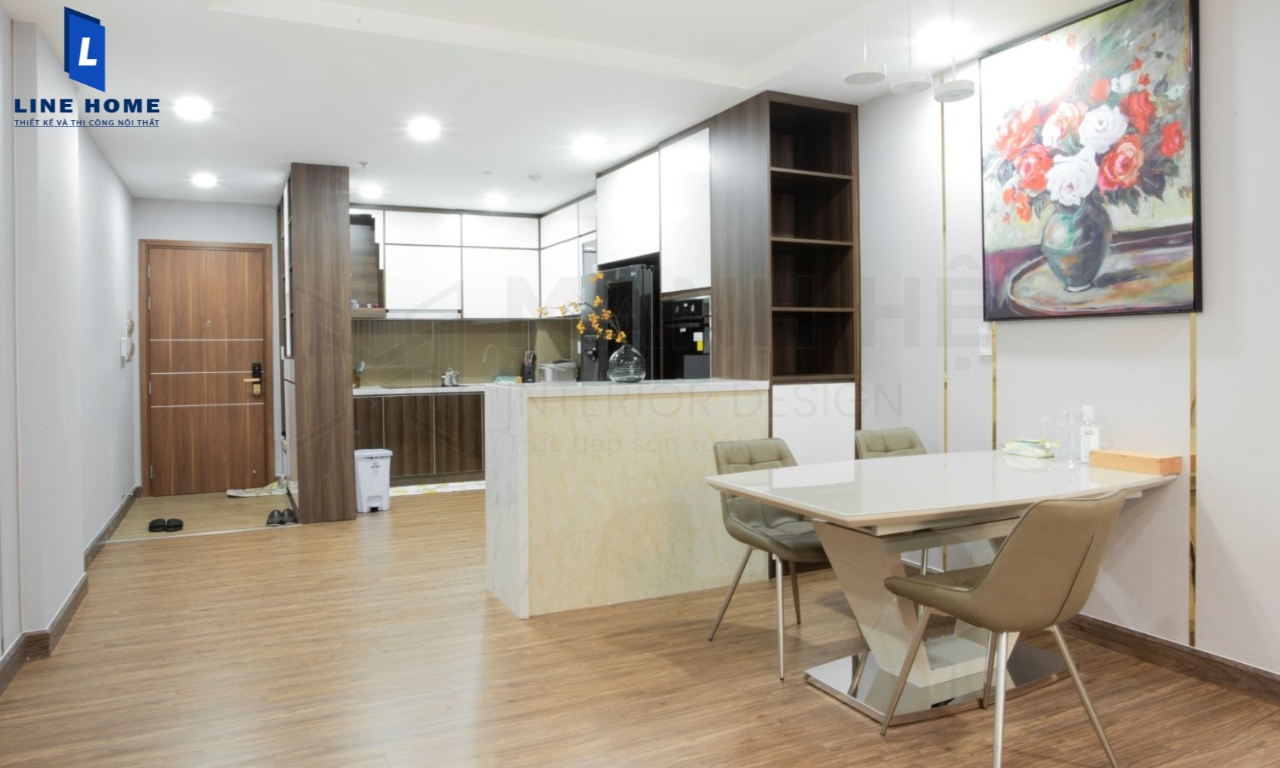Phòng khách liền bếp căn hộ chung cư không gian rộng, thoáng đãng