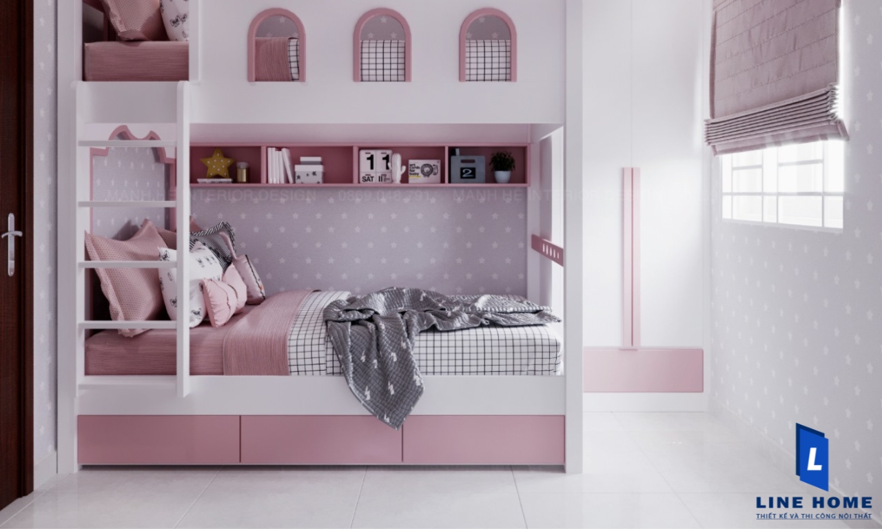 Chiếc giường tầng đa năng với thiết kế ngộ nghĩnh chính là điểm nổi bật đặc biệt cho cả căn phòng này. Đối với gia đình có hai bé thì việc bố trí một chiếc giường tầng đã không còn quá xa lạ bởi những tiện ích mà nó mang lại như vừa tiết kiệm được diện tích căn phòng, vừa tạo được khoảng không gian chung cho 2 bé thêm thân thiết.