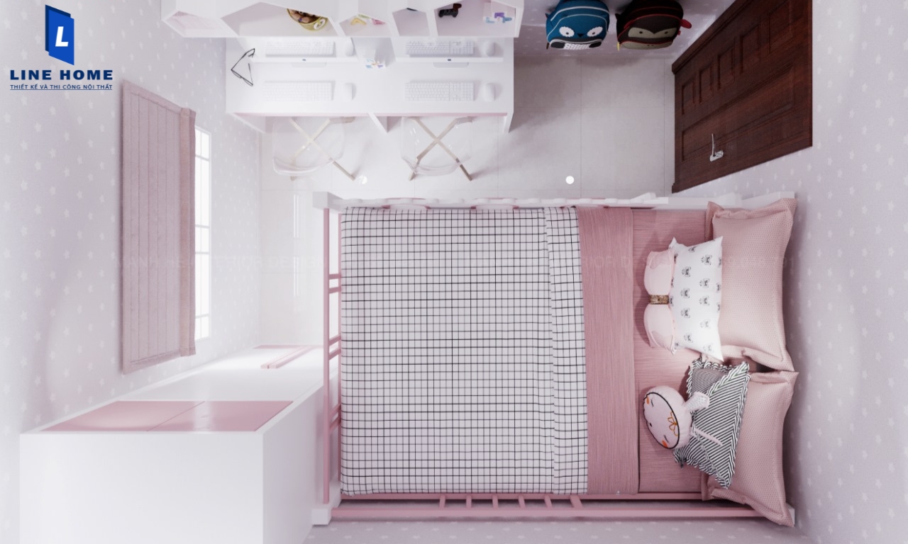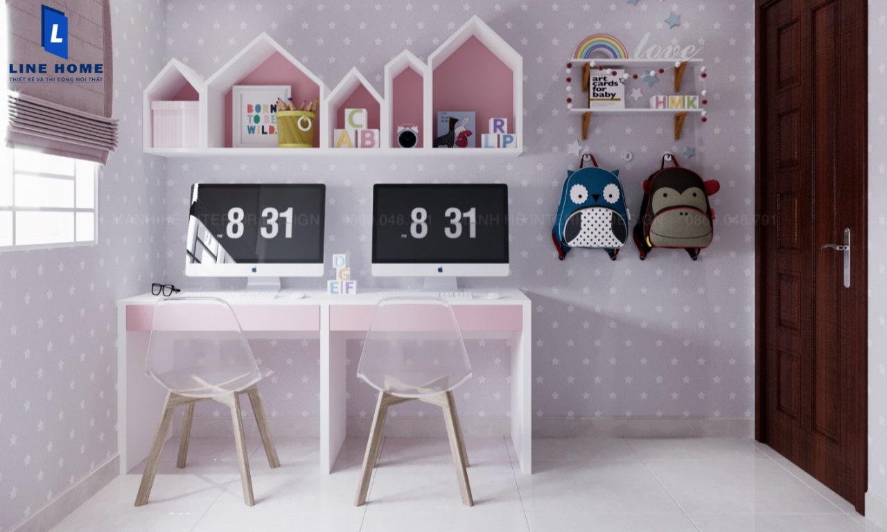 Bàn học đôi kèm kệ sách treo tường được thiết kế dọc theo bờ tường đối diện phòng ngủ rất tiện lợi và tối ưu diện tích. Bàn học cũng sử dụng hai màu trắng và hồng đồng bộ với gam màu tổng của căn phòng.